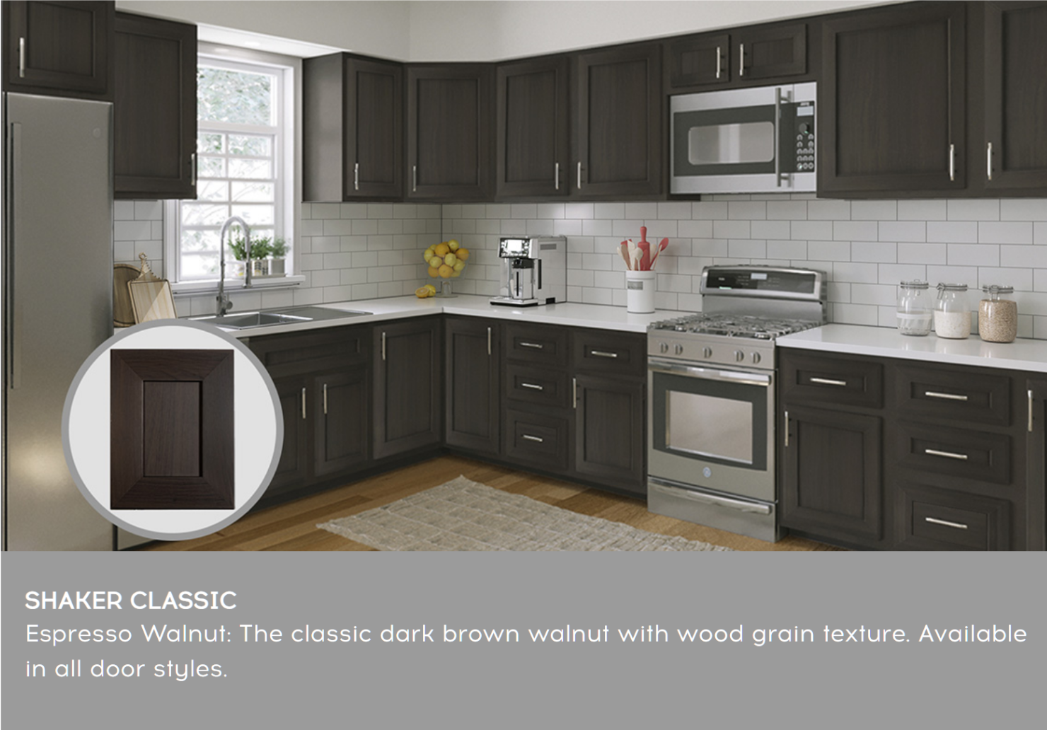 Espresso Walnut: Shaker Classic profile with a walnut grain finish previewed in a modern kitchen scene.